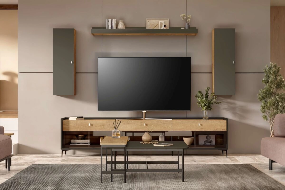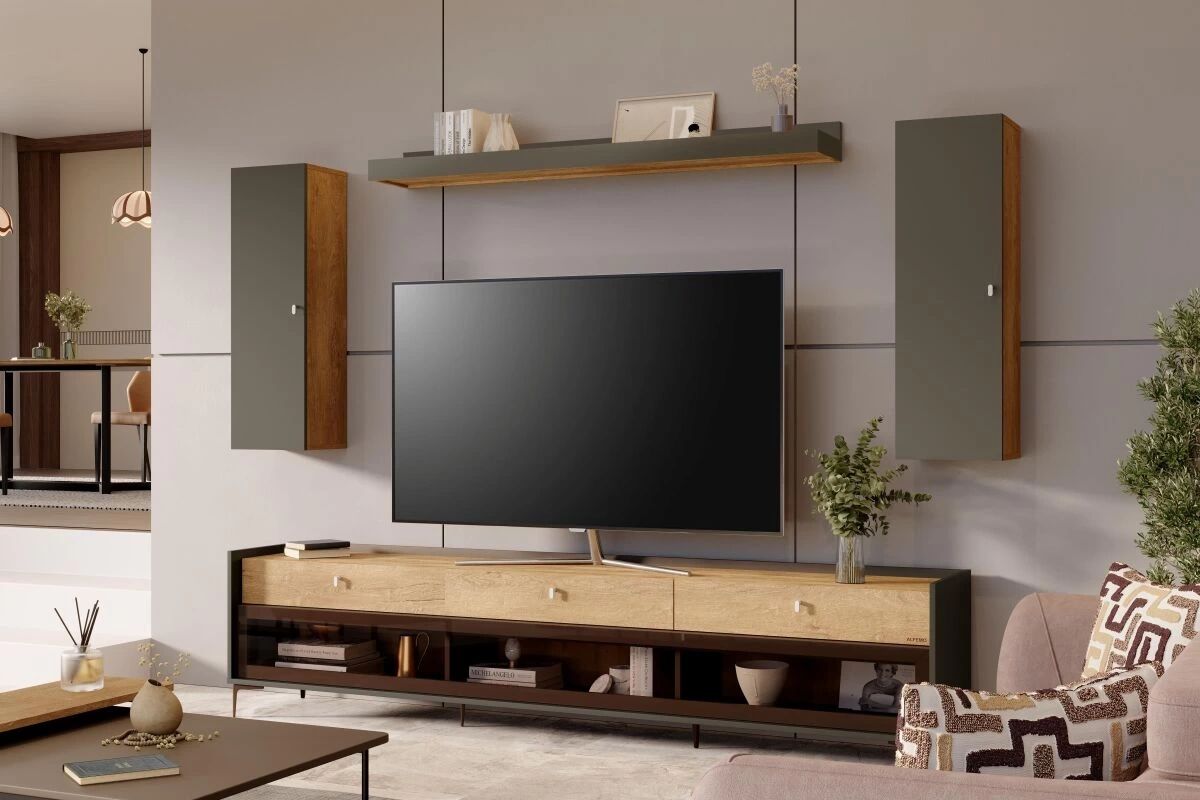 Metropol Yaşam Ünitesi, doğal meşe ve antrasit tonlarının uyumu ile yaşam alanlarınıza modern bir şıklık getiriyor. Meşenin sıcak, rustik dokusu samimi bir his sunarken, koyu tonlar minimal bir kontrast yaratarak sofistike bir tarz yakalıyor.. İşlevsel ve estetik tasarımıyla, modern dekorasyon severlerin tercih edeceği bir seçenek...